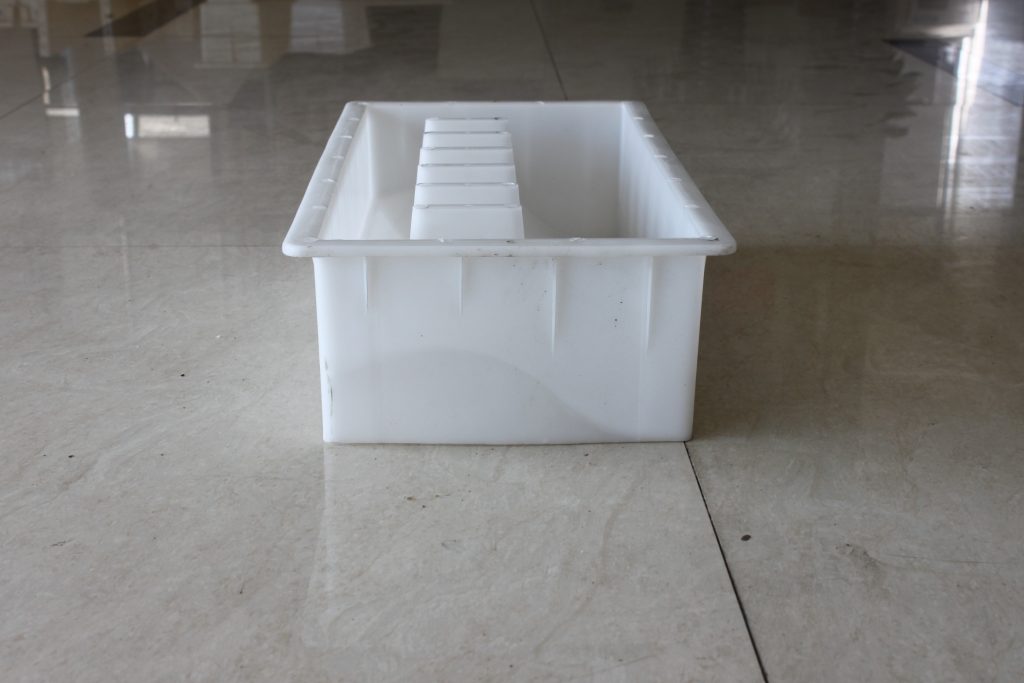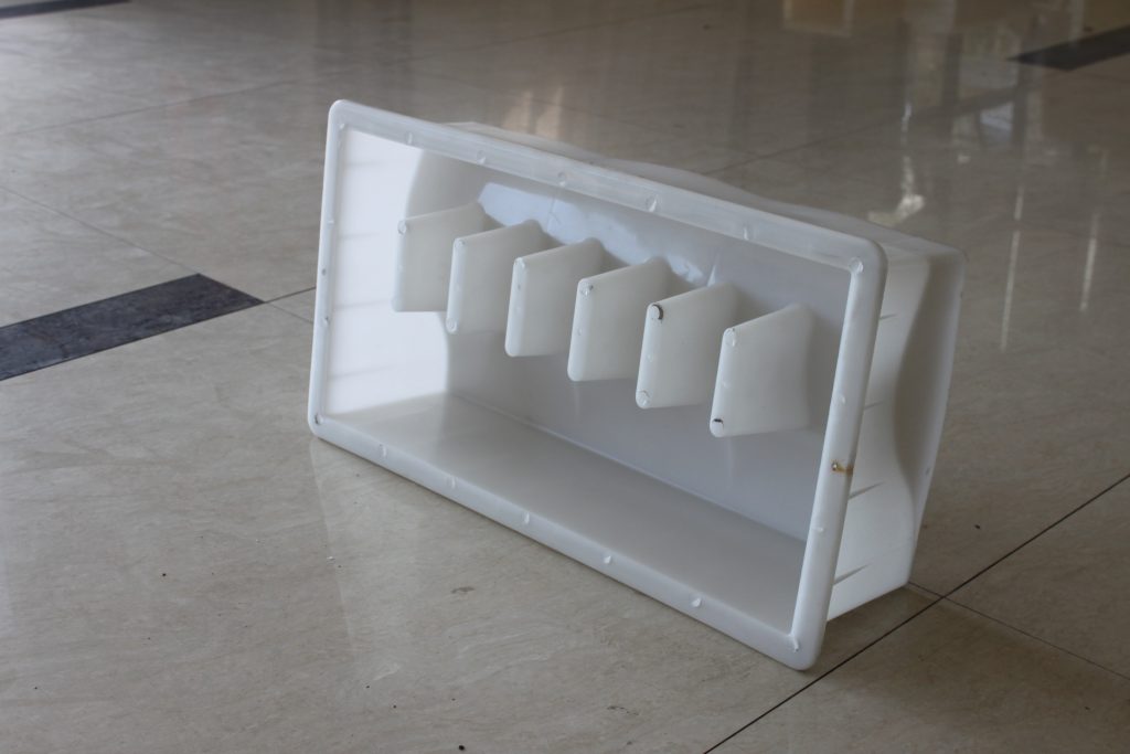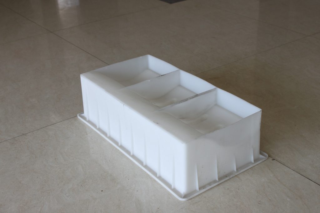 路牙石塑料模具整體外觀為長方形結構,因其尺寸較大,在模具的周邊及底部分別做了加強筋設計以保證在實際水泥路牙石澆筑過程中的穩定性。從模具內部的結構我們可以看出,塑料路牙石模具主要采用了S型坡面設計,六個塑料堵頭,即所制水泥路牙石的六個排水孔,實際應用較多的道路段為易積水或地理位置較低區域。