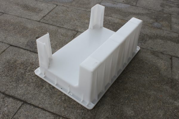此款擋渣塊防撞型路牙石模具所用原料為聚丙烯樹脂,經(jīng)注塑機(jī)高溫熔解后在鋼模具內(nèi)成型完成。乍一看似乎樣子有點(diǎn)奇怪,其實(shí)所澆筑水泥防撞路牙石呈L型,模具底部的兩個腳為支撐柱,方便實(shí)際擋渣塊、擋土塊的澆筑過程。為保障防撞路牙石模具的使用耐久性,更是在受力兩面增加了十六條加強(qiáng)筋,有效提升重復(fù)使用次數(shù),節(jié)儉生產(chǎn)成本。