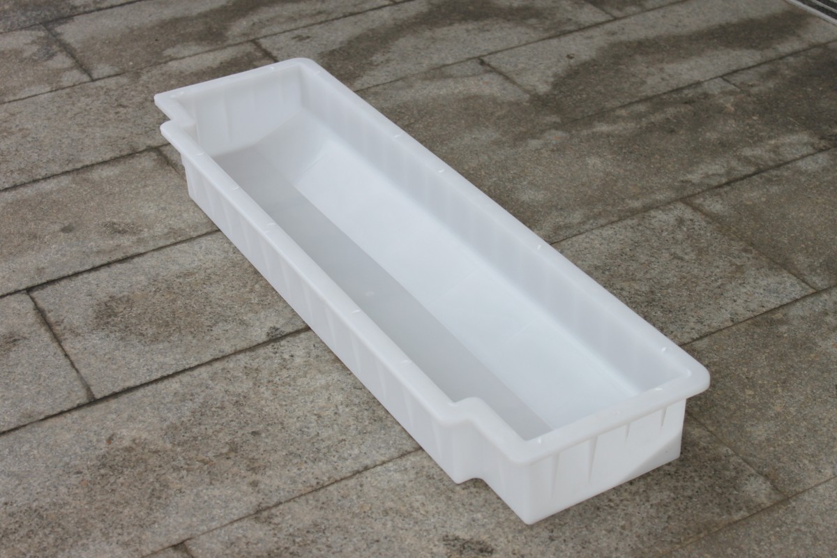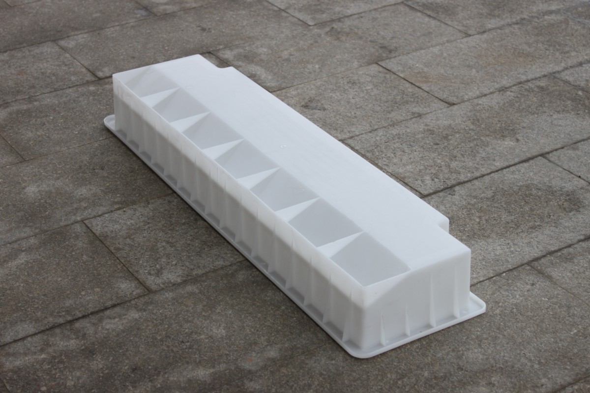 路側石模具使用純PP聚丙烯材料,以注塑工藝一次成型,主要特色為路側石外形為缺角及有一定坡度。成品整體工藝表面光滑,內部結構合理,水泥構件脫模方面,在使用次數上更為耐用。主要使用在高鐵高速及市政公路道路側石的預制。