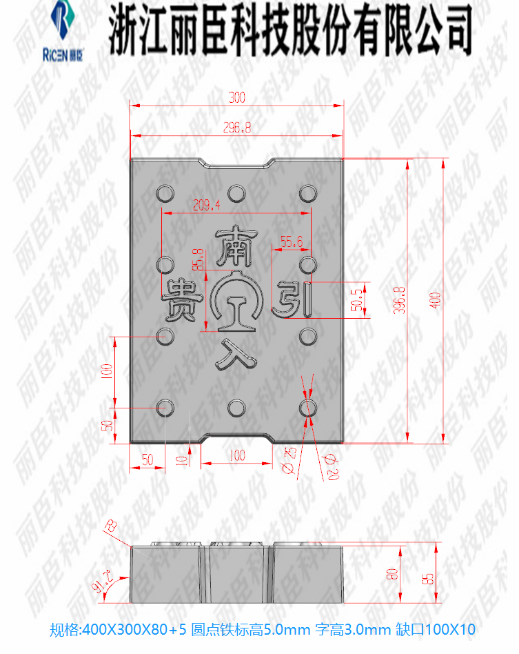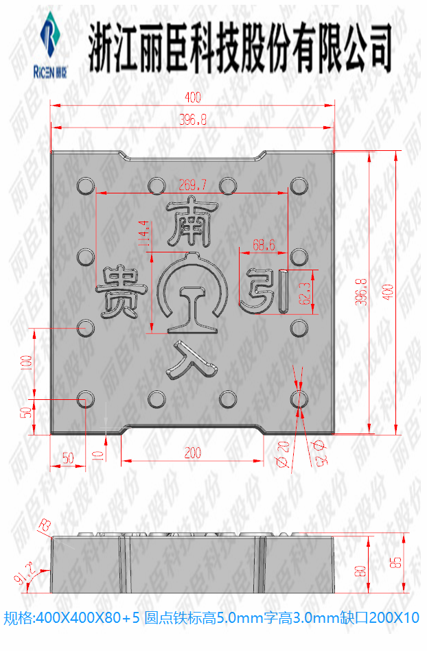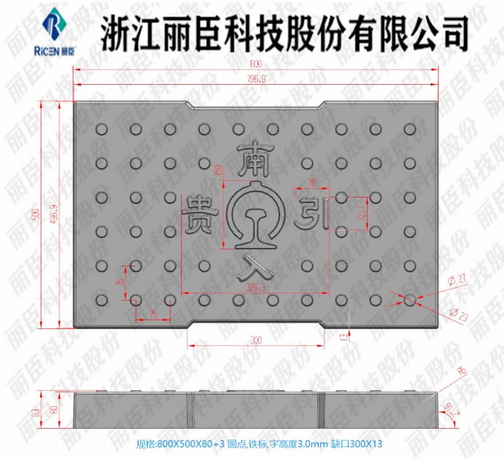 貴南引入系列蓋板,主要用于高鐵隧道蓋板定制系列、蓋板為缺口圓點帶鐵標、板面帶字,為“貴南引入”。這款系列有三款尺寸蓋板尺寸分別為40cm*30cm、40cm*40cm、80cm*50cm、厚度相同為8cm厚,且三款模具的缺口也不同從小到大的尺寸缺口為10cm、20cm、30cm缺口,這款蓋板為2022年新生產的蓋板。
