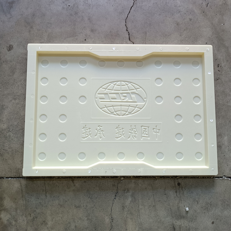 模具較薄,主要用于rpc材質(zhì)預(yù)制制作,花紋為缺口圓點(diǎn),中間帶有中鐵圖標(biāo),底部設(shè)有中國(guó)鐵建 承建字樣,為中鐵專用模具。