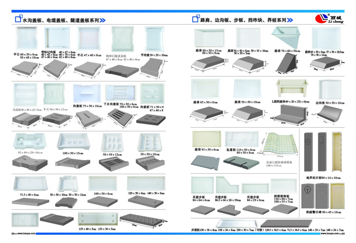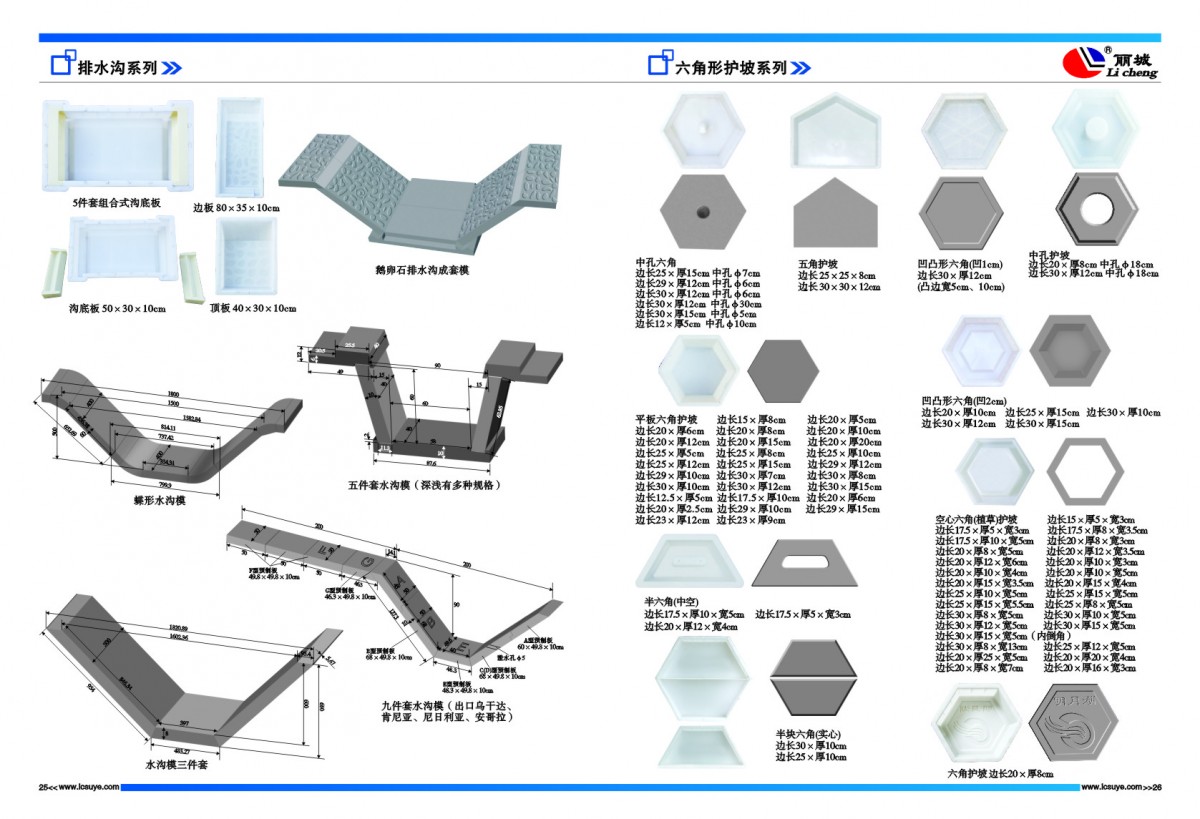 麗臣塑業主營產品:現澆塑料模板,六角護坡模具、高鐵水泥護欄模具、溝蓋板模具、路沿石模具、彩磚模具、井蓋模具等一系列水泥制品塑料、鋼模具及配套的機械設備配件等,如條紋磚條紋機、脫模機、高鐵護欄離心機、加料機等。